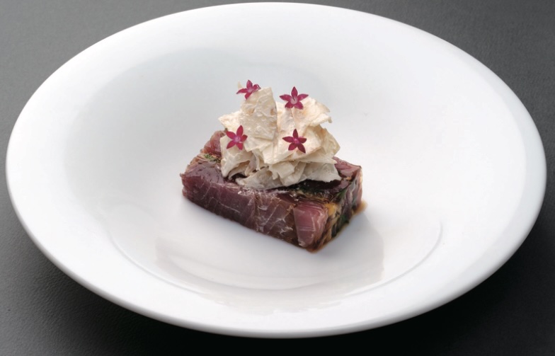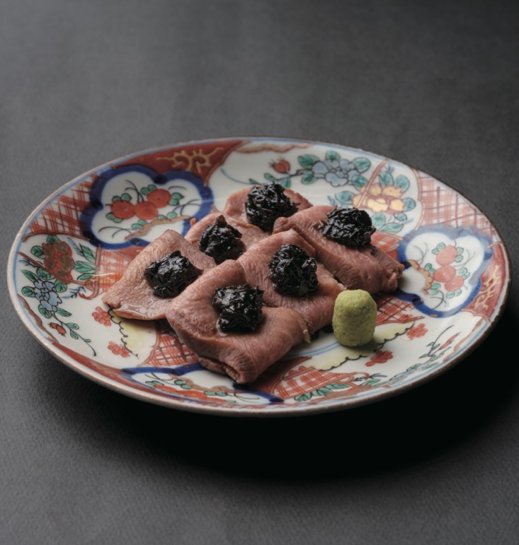 保護中: 低温調理した牛タン刺し 燻製海苔で
